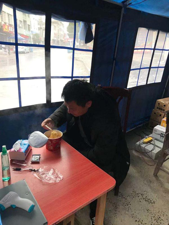中午时分,石强同志和驻守干部一起仅吃碗泡面,又投入到紧张的工作中……
