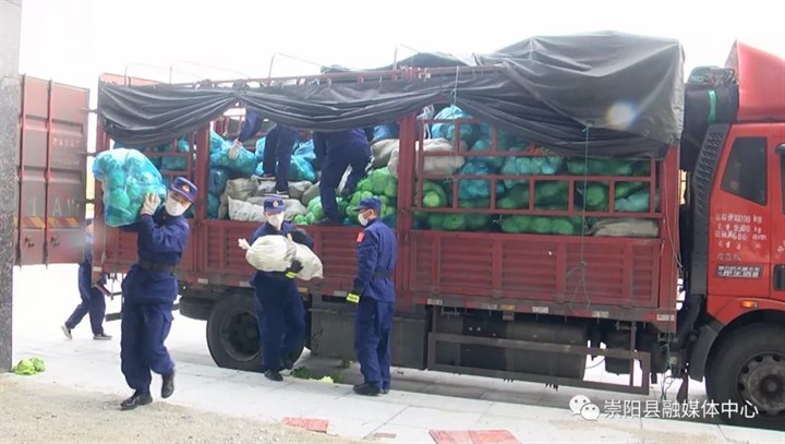 3月4日,记者在人民大道救援物资临时停放仓库看到,县消防救援大队119党员突击队的队员们正在有序地搬运来自江苏宜兴的爱心捐赠物资,这批物资共计10吨,主要为包菜、萝卜、菠菜等蔬菜。