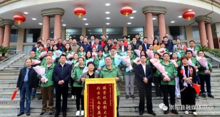 送别仪式上,杭莺、郑俊华等县领导为全体云南医疗队队员献上鲜花。随后,杭莺向云南医疗队队长董昭兴颁授印有“援崇抗疫彰大爱 彩云之南皆英雄”锦旗并合影留念。